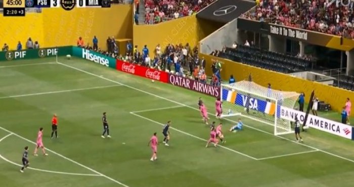 杜埃造阿维莱斯乌龙!第45分钟,杜埃右路下底传中,皮球打在阿维莱斯身上折射,随后飞进自家大门,巴黎圣日耳曼3-0迈阿密国际!↓